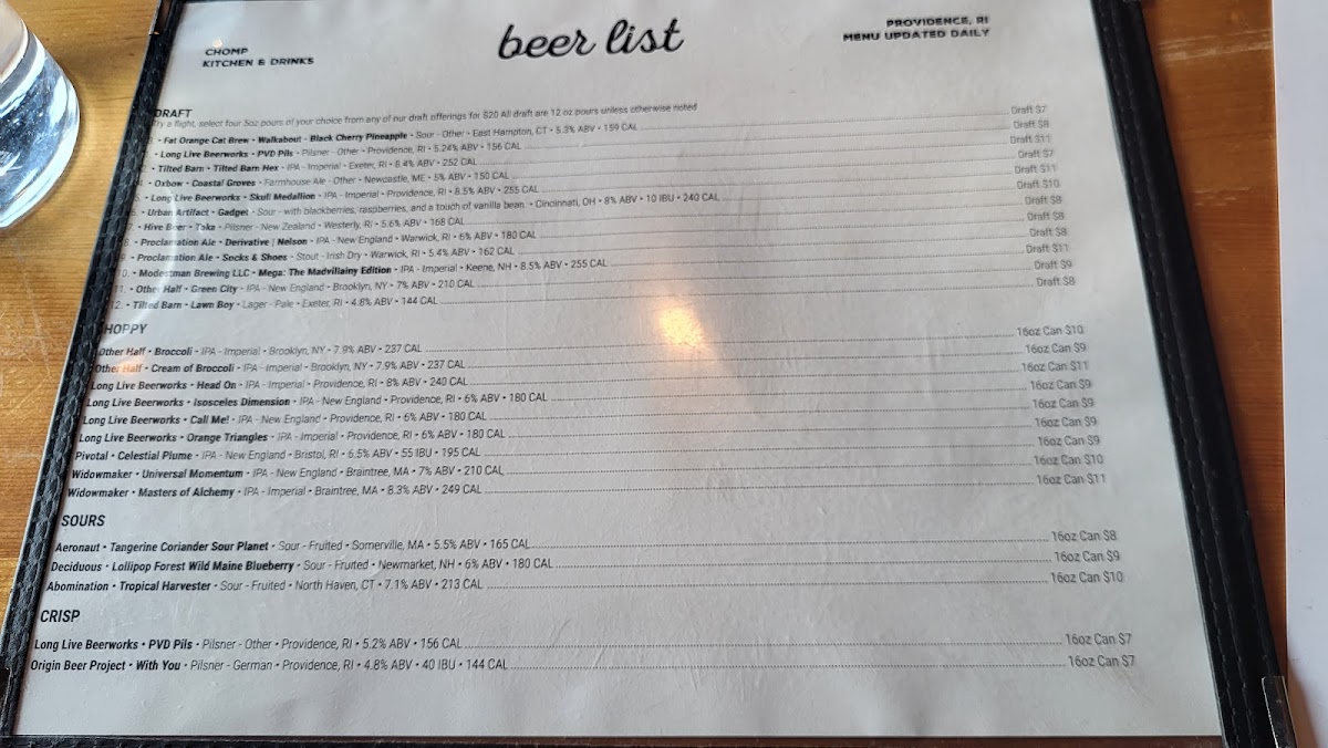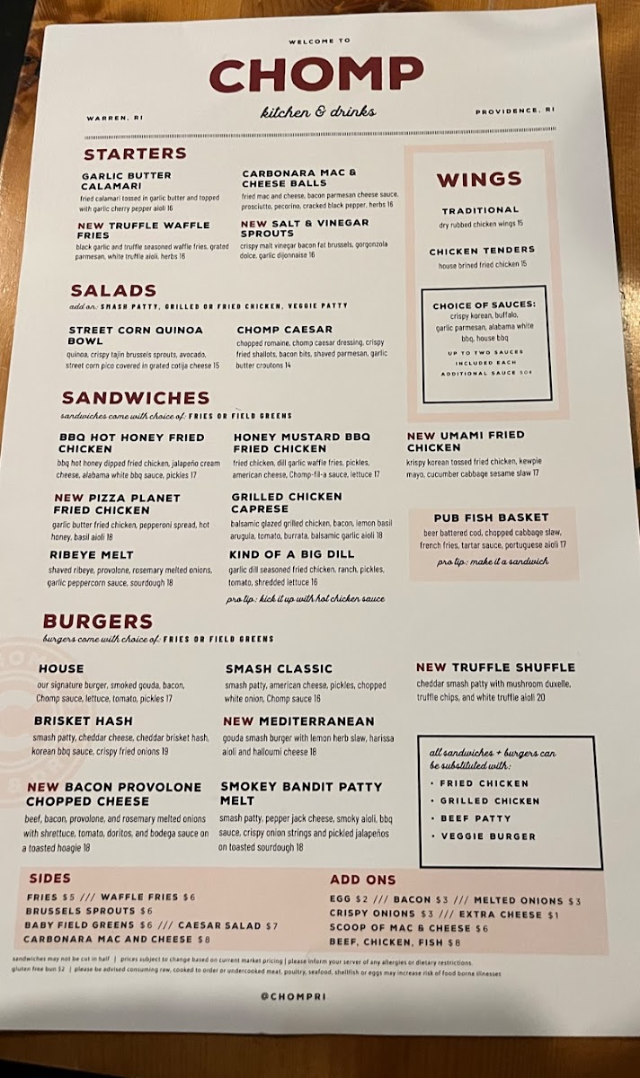 Welcome to Chomp Kitchen and Drinks, nestled at 117 Ives St, Providence, RI! This vibrant spot has quickly become a local favorite, with rave reviews highlighting its excellent food and drink offerings. The menu boasts a variety of mouthwatering choices, from the must-try Brussel sprouts to their acclaimed chicken sandwiches. Diners have praised the Bang Bang Banh Mi Chicken sandwich for its explosive flavors, featuring perfectly seasoned fried chicken complemented by crunchy pickled vegetables.